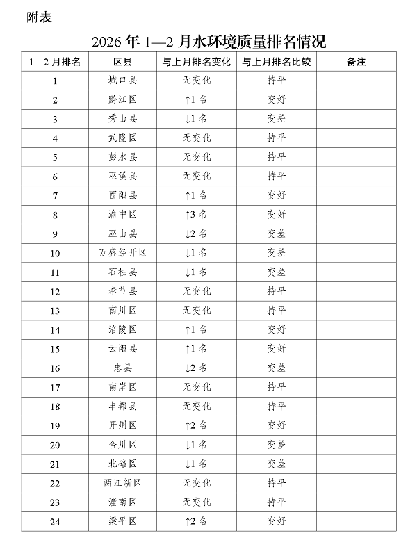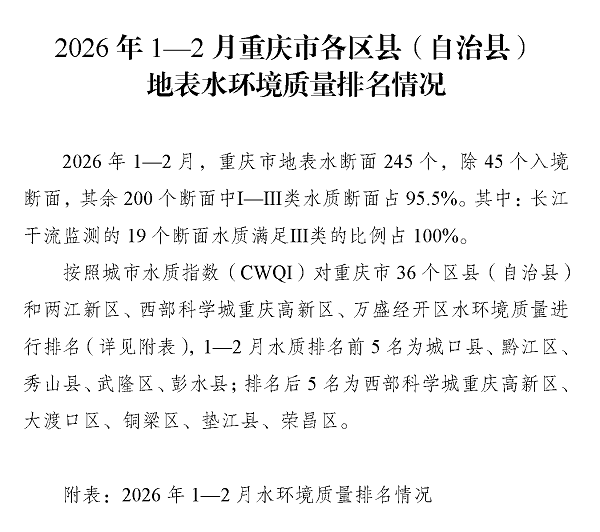2026年1—2月重庆市各区县(自治县)地表水环境质量排名情况