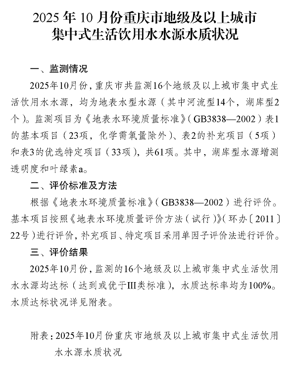 2025年10月份重庆市地级及以上城市集中式生活饮用水水源水质状况