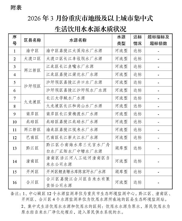 2026年3月份重庆市地级及以上城市集中式生活饮用水水源水质状况