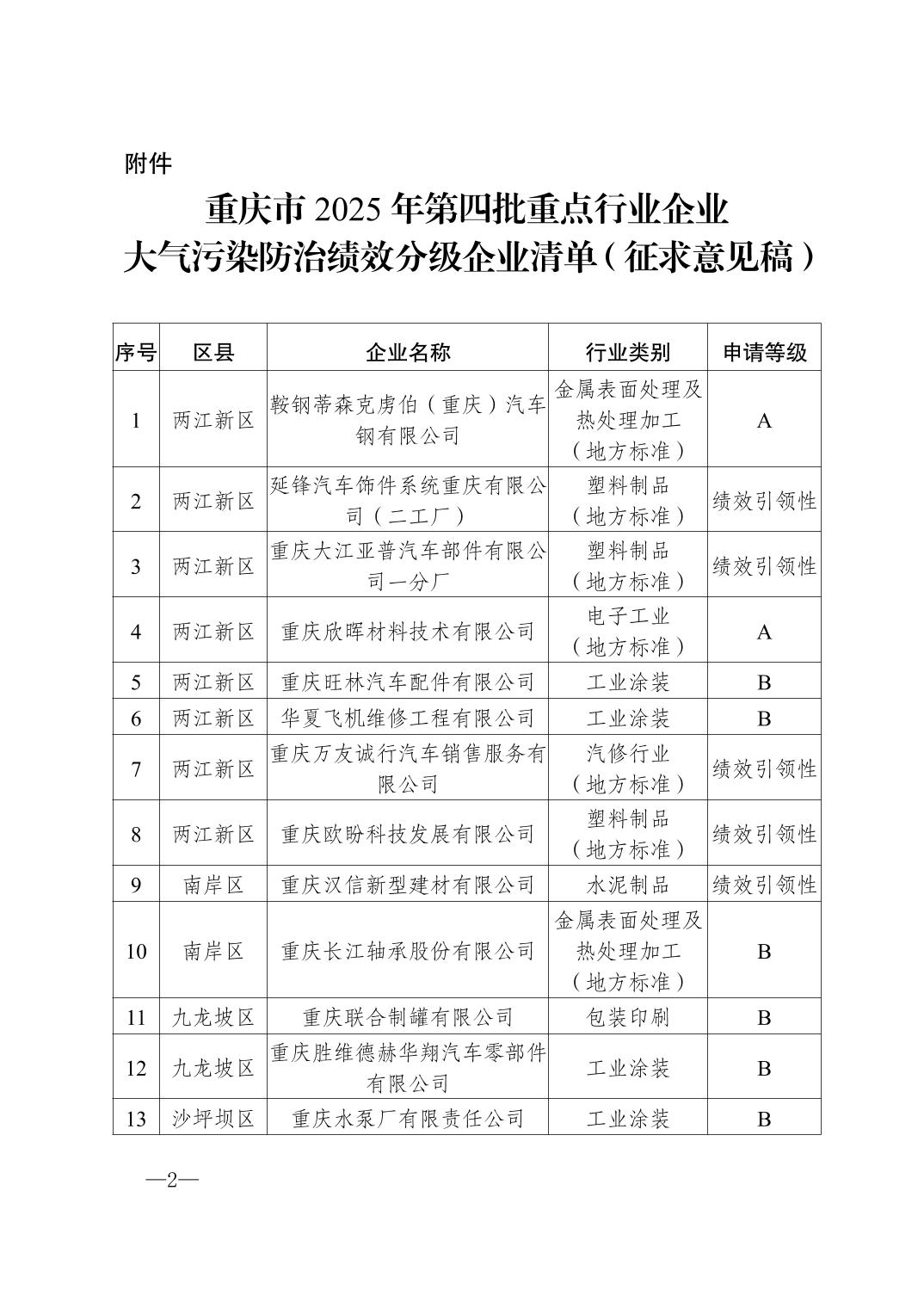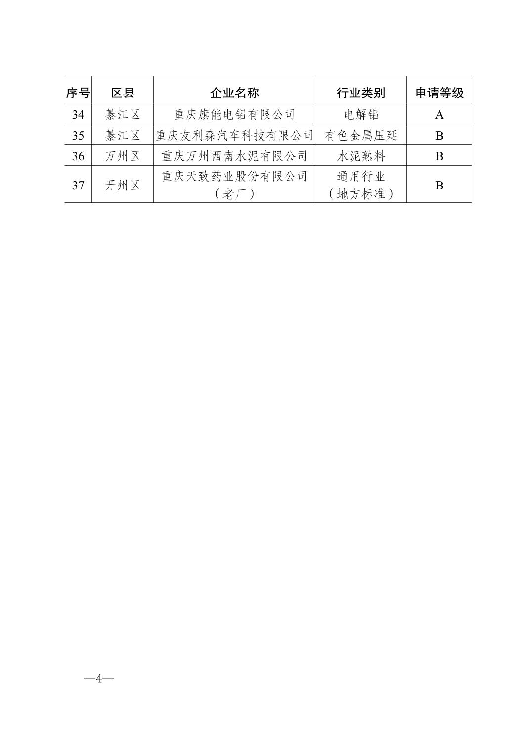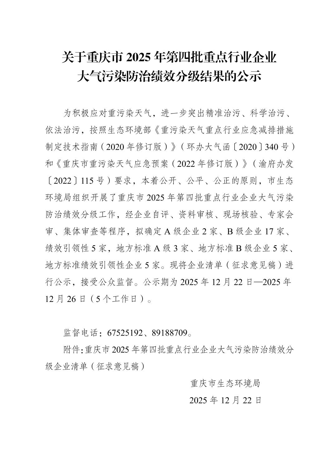 关于重庆市 2025 年第四批重点行业企业大气污染防治绩效分级结果的公示