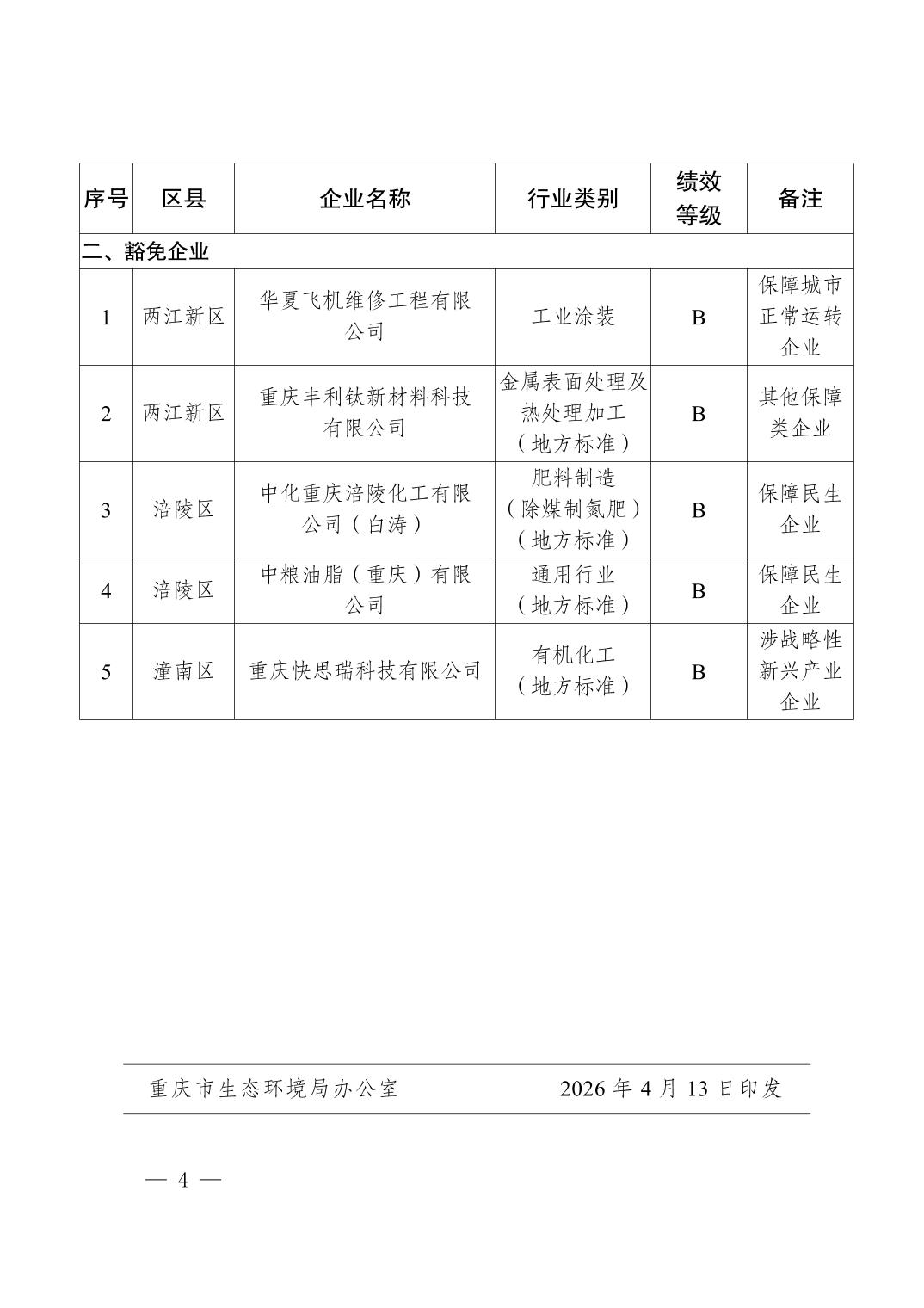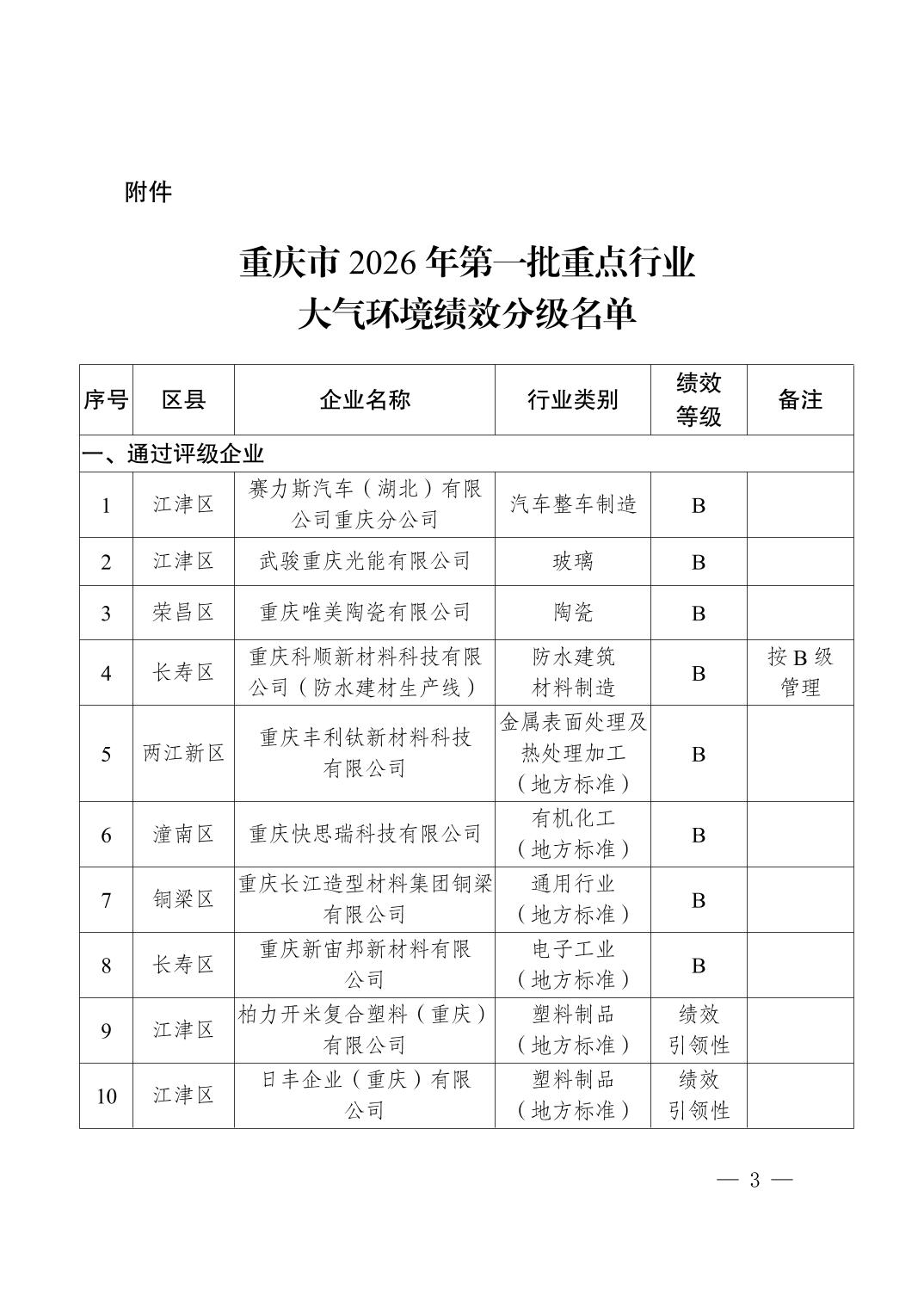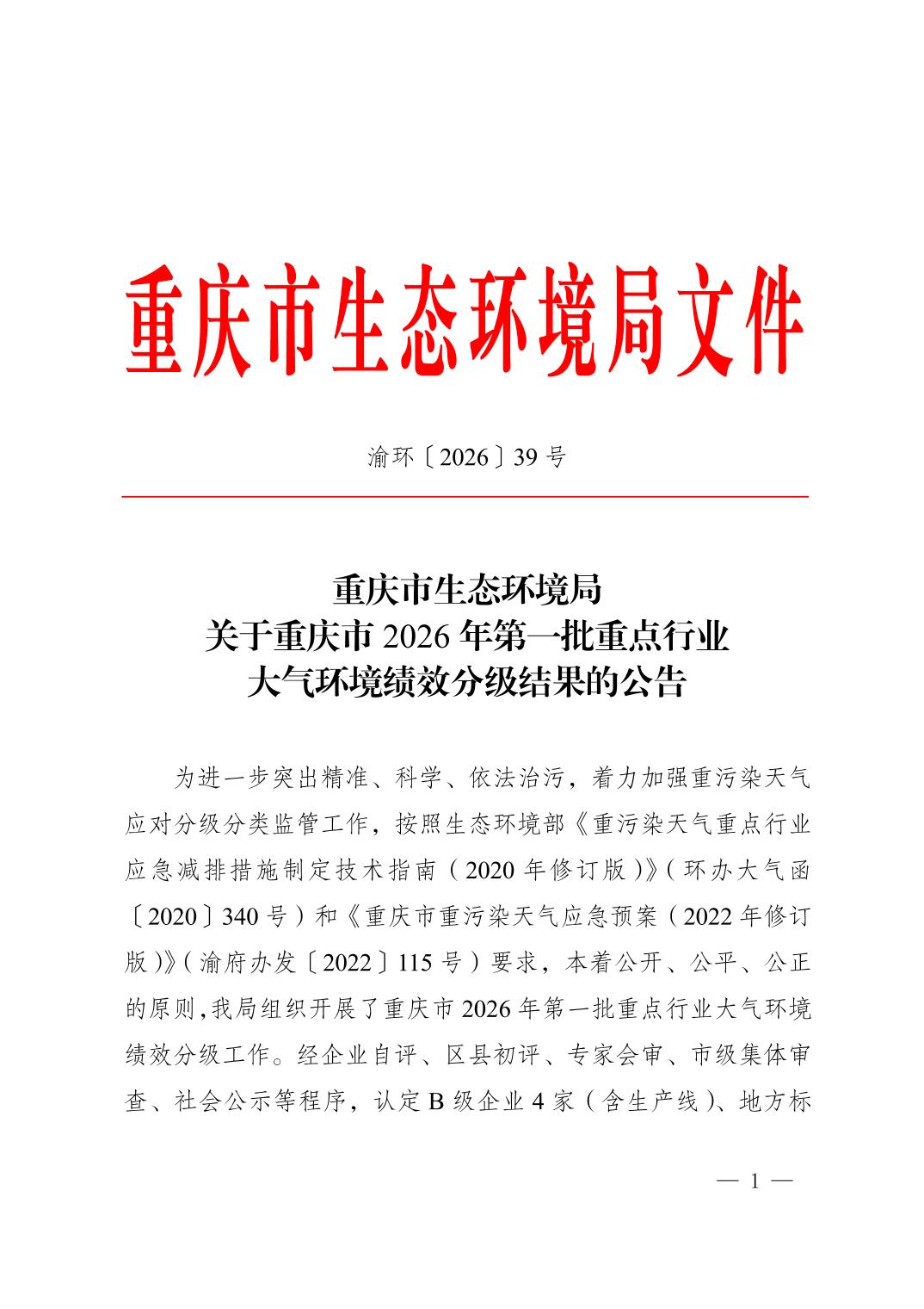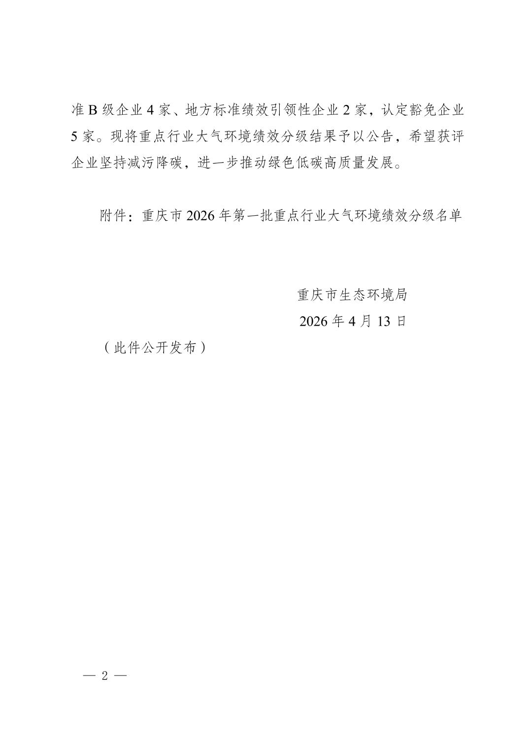 重庆市生态环境局关于重庆市2026年第一批重点行业大气环境绩效分级结果的公告