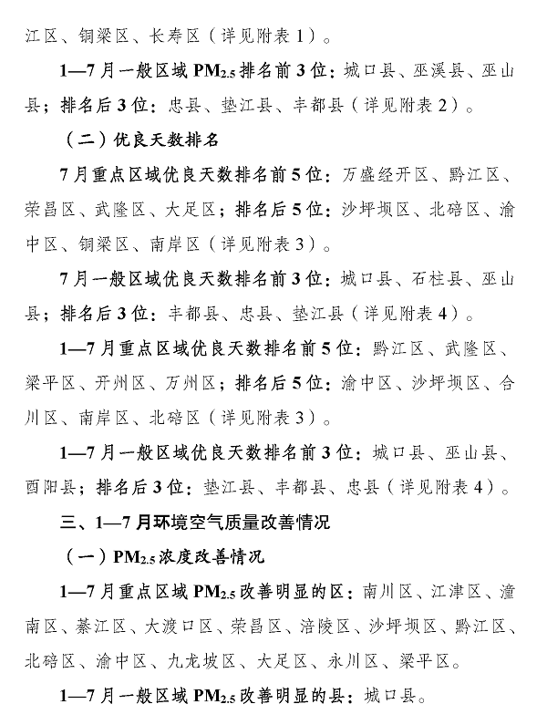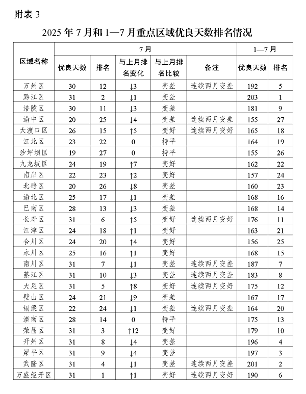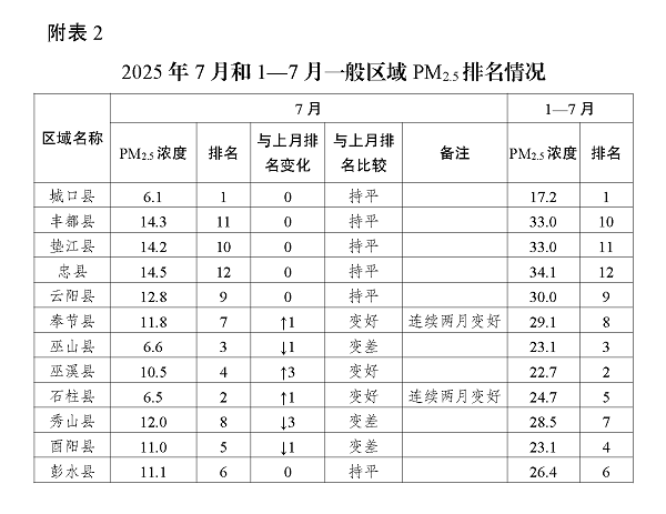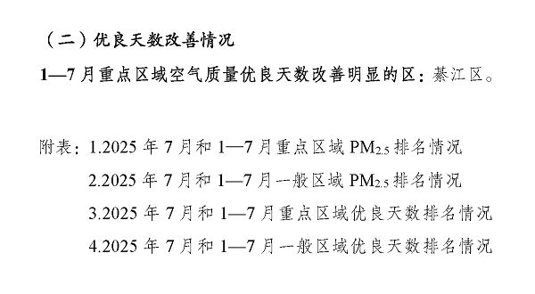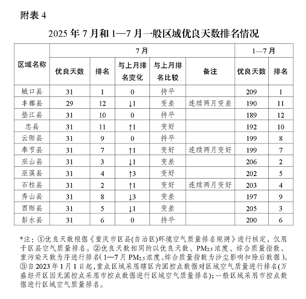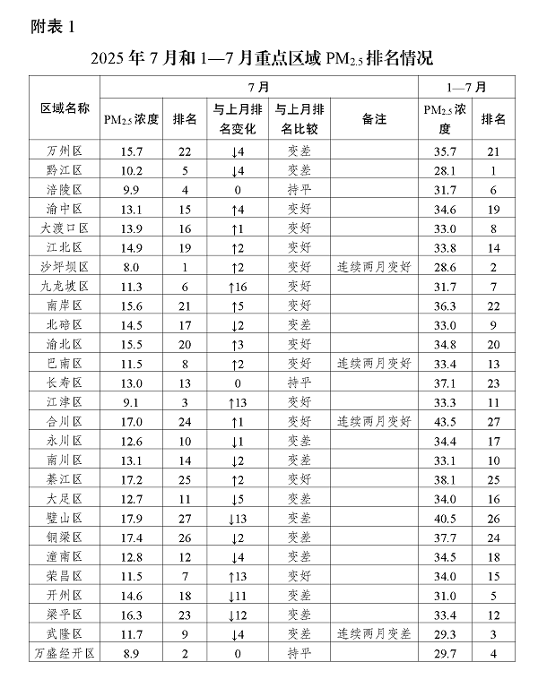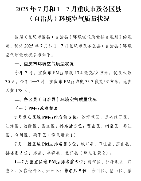 2025年7月和1-7月重庆市及各区县(自治县)环境空气质量状况