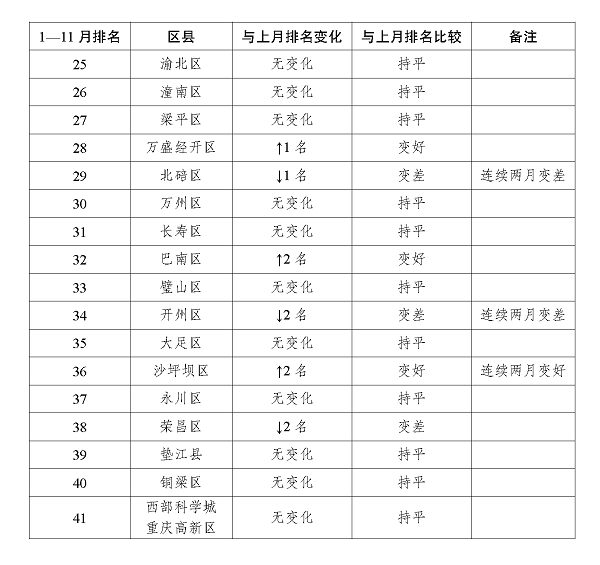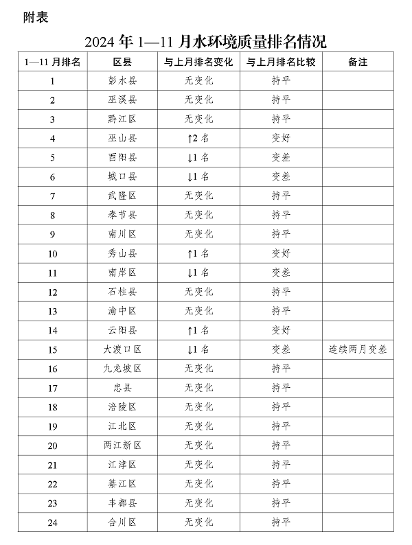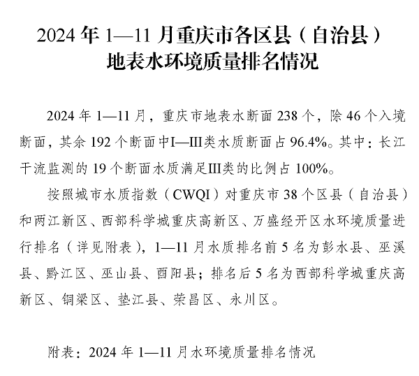 2024年1—11月重庆市各区县(自治县)地表水环境质量排名情况