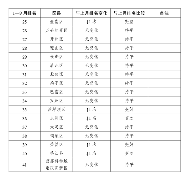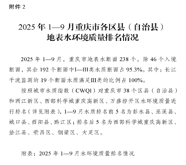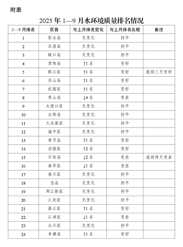 2025年1—9月重庆市各区县(自治县)地表水环境质量排名情况