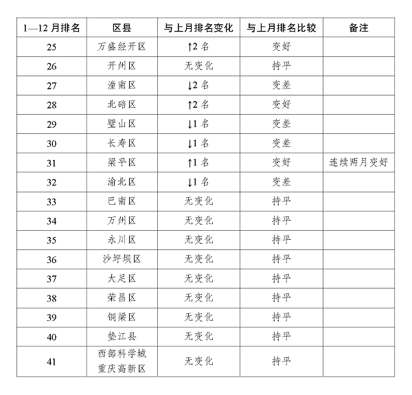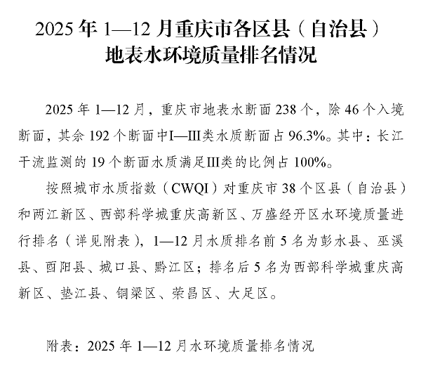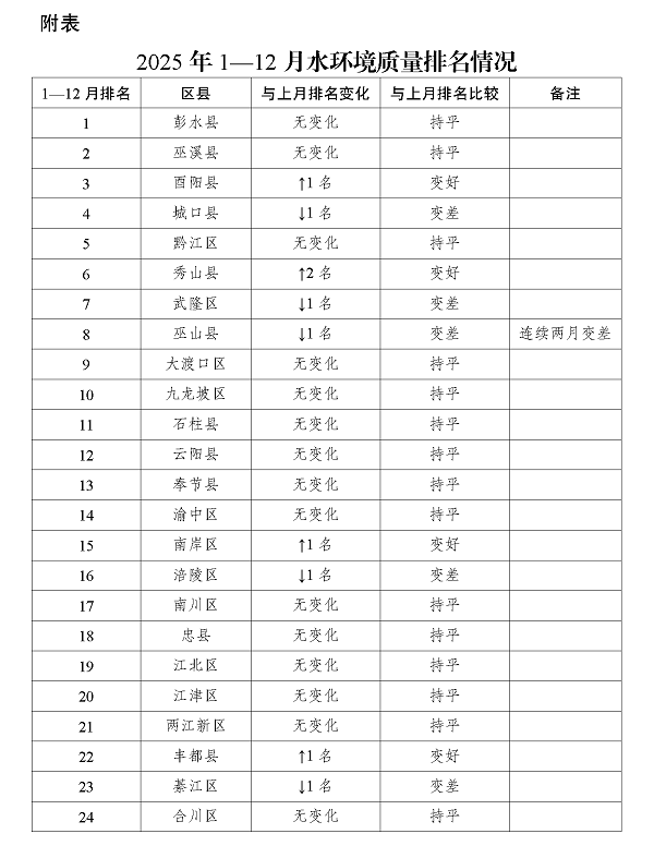2025年1—12月重庆市各区县(自治县)地表水环境质量排名情况