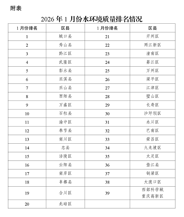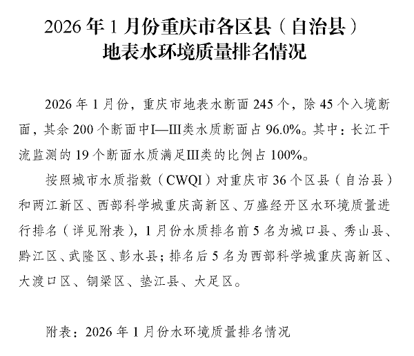 2026年1月份重庆市各区县(自治县)地表水环境质量排名情况