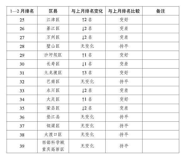 2026年1—2月重庆市各区县(自治县)地表水环境质量排名情况