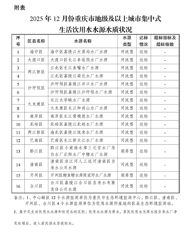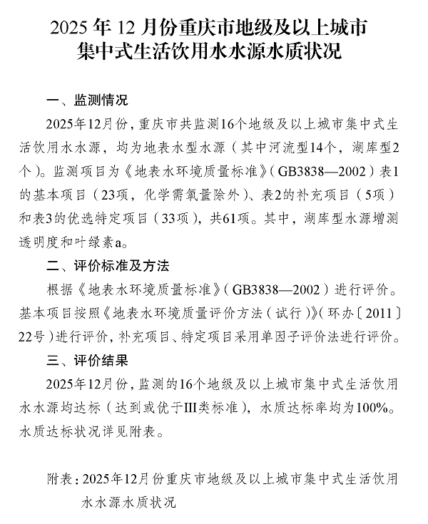 2025年12月份重庆市地级及以上城市集中式生活饮用水水源水质状况