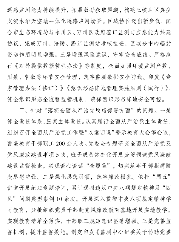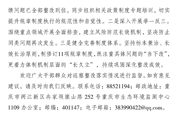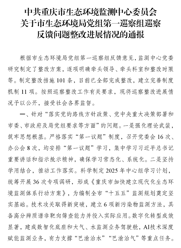 中共重庆市生态环境监测中心委员会关于市生态环境局党组第一巡察组巡察反馈问题整改进展情况的通报